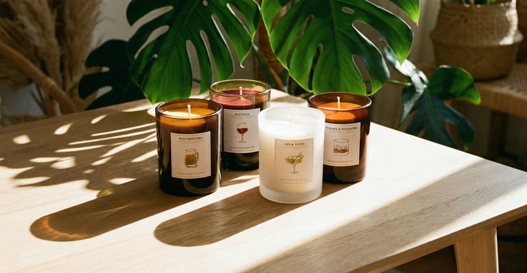 Each candle is carefully poured by hand and inspired by your favorite drinks and moments: the smoky warmth of Whisky & Woodfire, the crisp freshness of Gin & Tonic with cucumber, lemon, and lime, the fruity richness of Red Wine, and the hearty, malty aroma of a Beer Brewery
